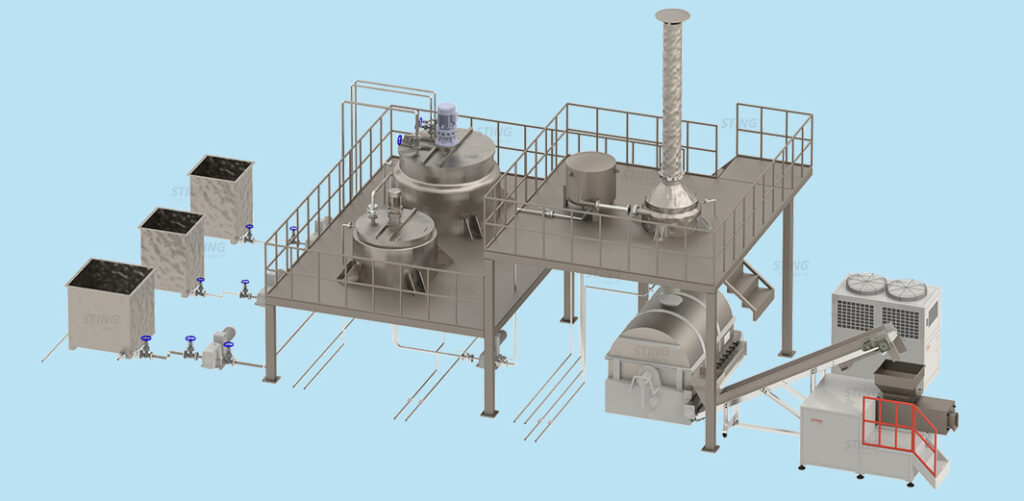 The LAS500 Pro series is a plant for producing soap noodles using raw materials such as oils, stearin, and fatty acids. This series boasts a production capacity of 500 kg/h.The mixed oils and fats is pumped according to specific recipe into a saponification tank via a pump. The saponification reaction between the oils and alkali transforms the mixture into a viscous soap solution. This soap solution, which contains a significant amount of water, is heated by a conical heater. Through heating, the water in the soap liquid evaporates, and the viscous soap base falls from the bottom discharge port of the conical heater into the roller flaker below. Cooling water is passed through the roller of the flaker. When the hot soap base encounters the cooling water, it solidifies into flakes and is scraped off by the cutting knife of the rotating drum to form soap flakes. The soap flakes are then passed through the granulator to form soap Noodles.